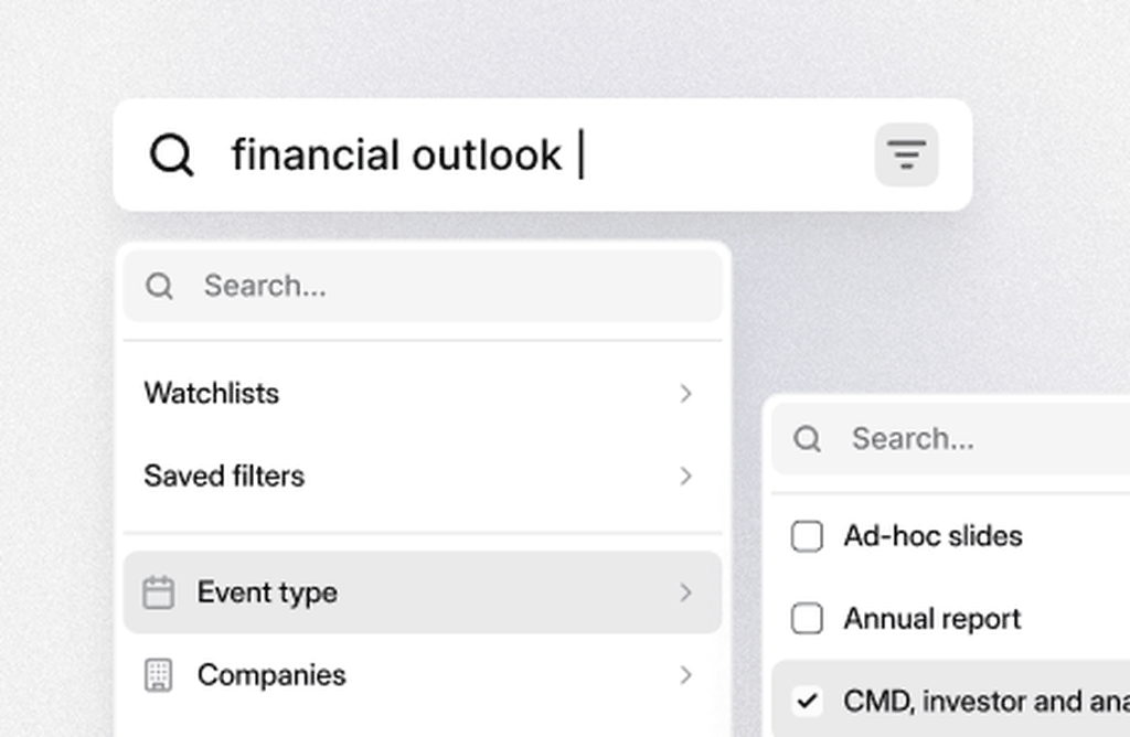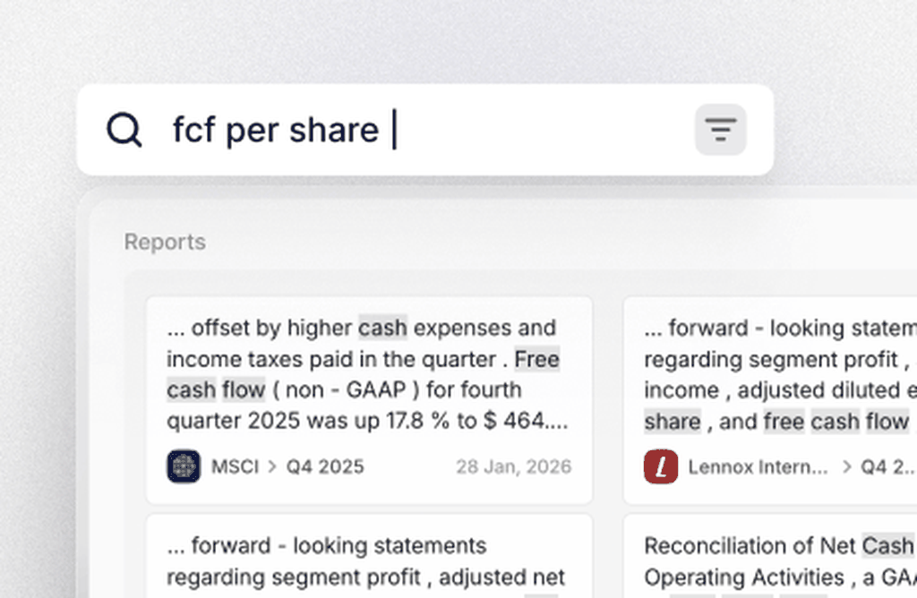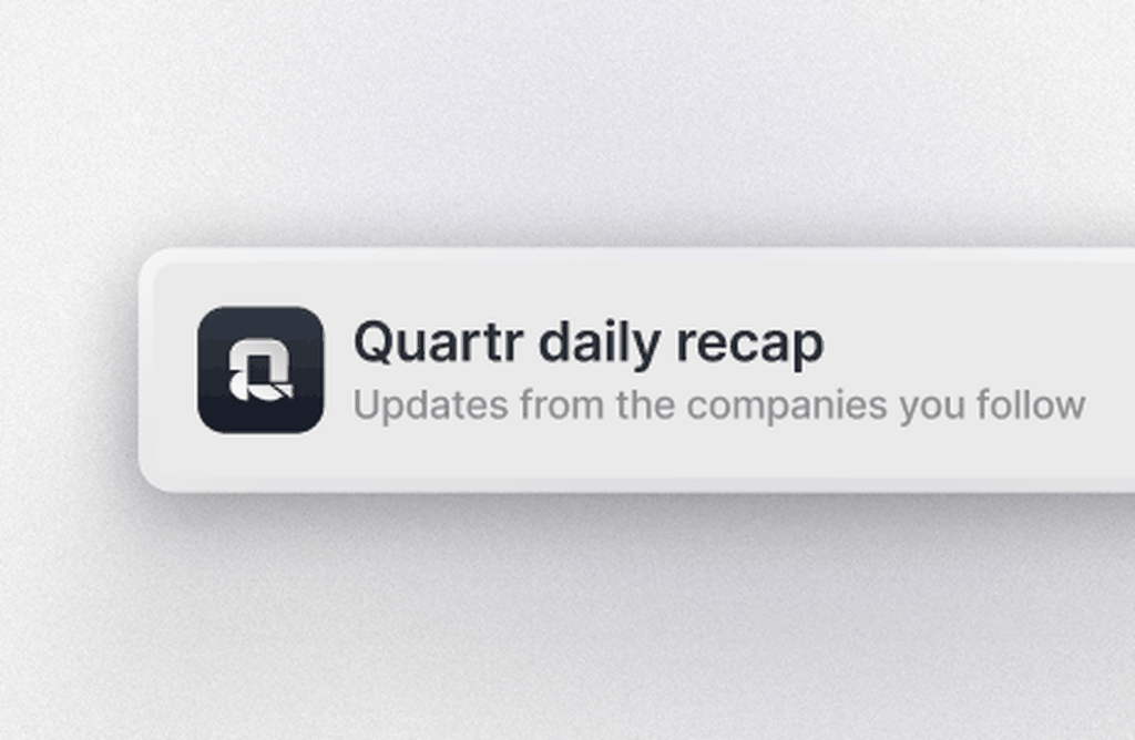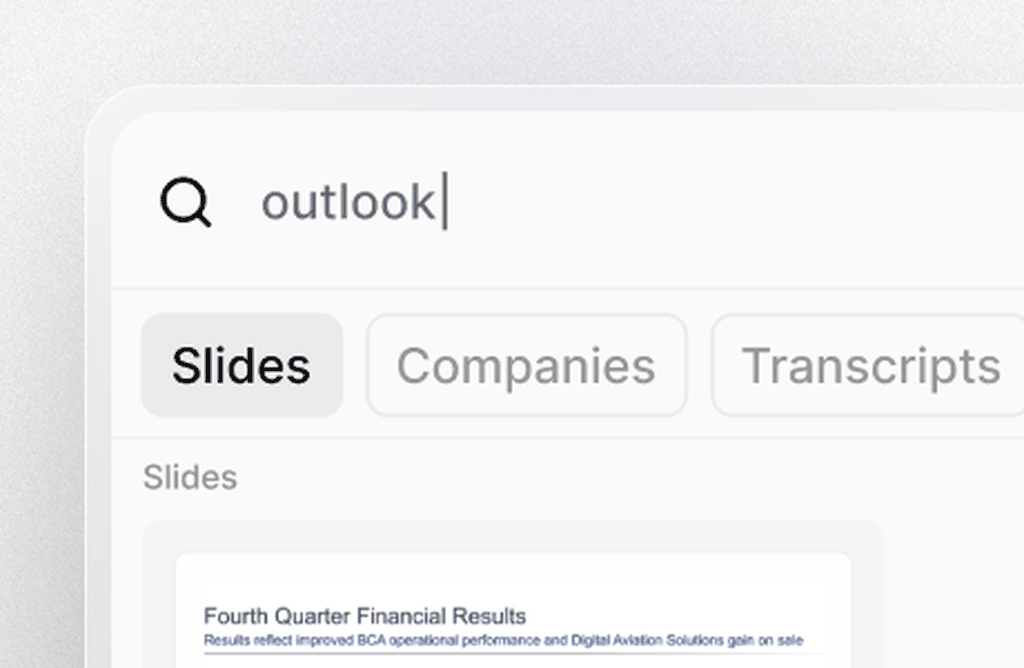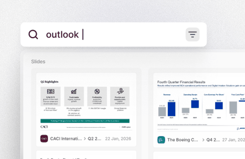 FeaturesAn overview of Quartr's features and how to use them.AI chatFind the information you need faster.Global searchSearch across all IR documents.Slide searchScan keyword mentions across slide presentations globally.Transcript searchFind what was said, who said it, and when. Filings searchFind the information you need faster.Live earnings calls & transcriptsBe the first to know. Act with conviction.Event calendarSmarter time management.WatchlistsOrganize your coverage.Keywords alertsNever miss what matters.Daily & weekly recapsAlways stay up to date.SummariesSee highlights instantly from any event.Slide history comparisonTrack narrative shifts.Transcript highlightingEasily store key findings.ExportBring custom datasets into other tools.Previous-AI chatNext