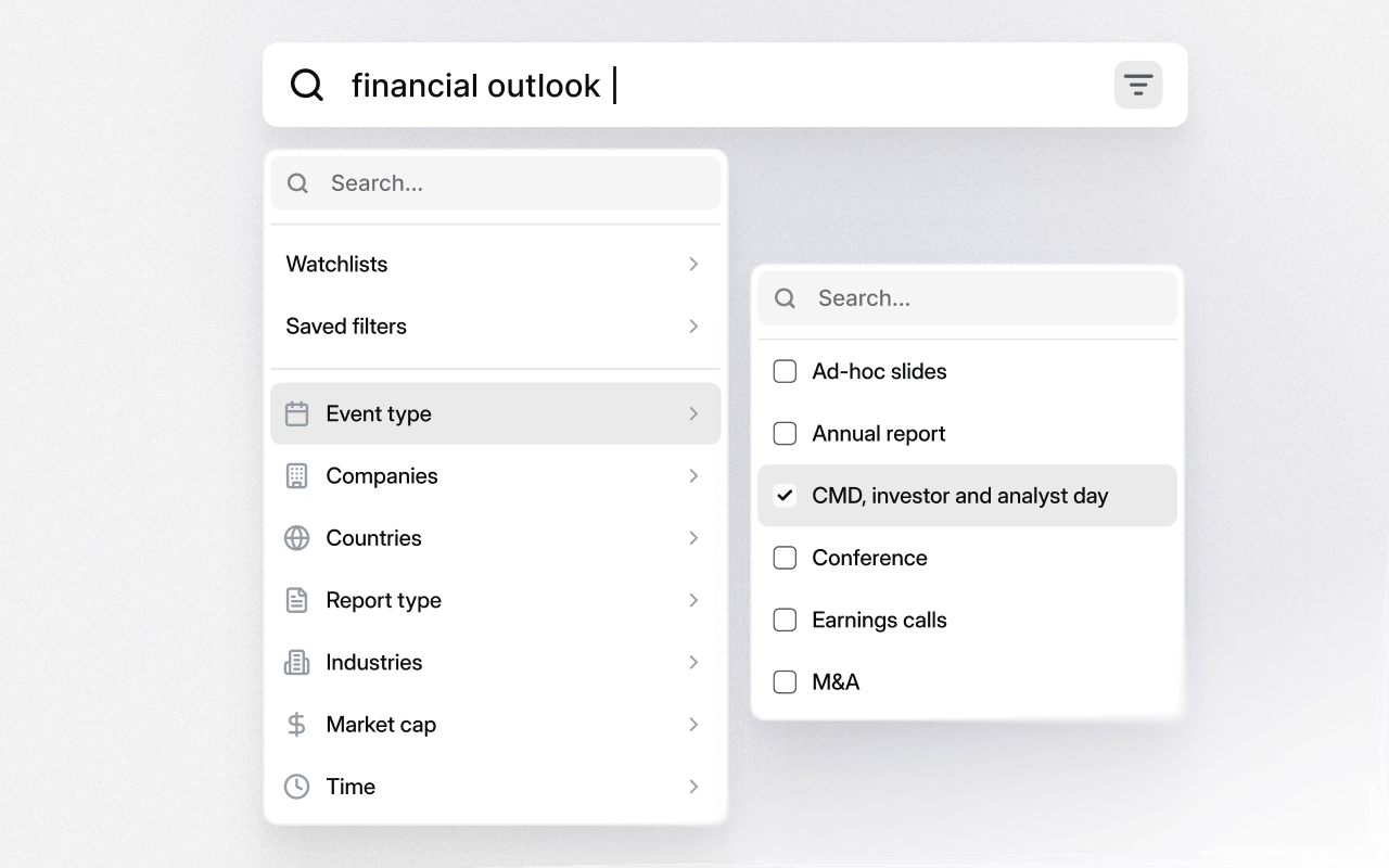 Global search lets you search for any keyword across all investor relations documents at once: earnings call and event transcripts, filings, and slide presentations. Every search scans the full database of 40M+ first-party documents.You can also narrow your scope with customer filters such as document type, event type, time series, market cap, industries, and more.