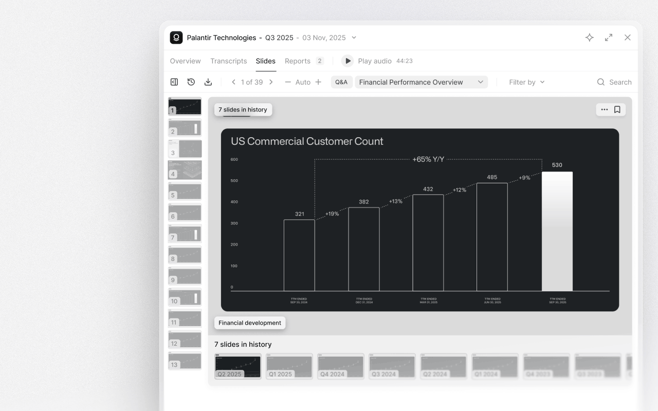 Slide history comparison lets you track changes in messaging, KPIs, and strategic focus over time. By comparing individual slides quarter by quarter or year by year, you can quickly spot what's changed, what's been emphasized, and what's quietly disappeared.As you review any slide in a presentation, its historical versions appear directly beneath it, letting you scroll through past iterations without leaving your workflow.