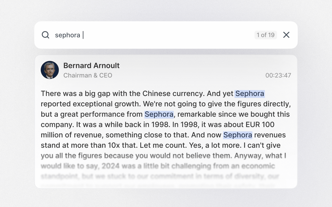 Transcript search lets you search across every spoken word from public company events. Instantly find where a topic was mentioned, who said it, and in what context – across earnings calls, capital markets days, investor conferences, and more.Every result is sourced from first-party transcripts and fully time-aligned with the original audio, so you can move seamlessly between text and voice.